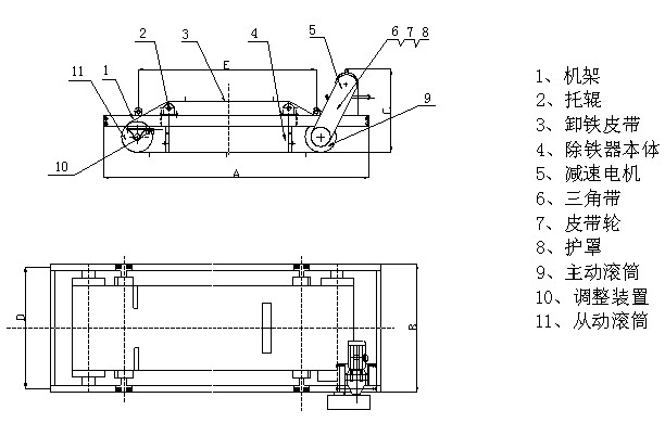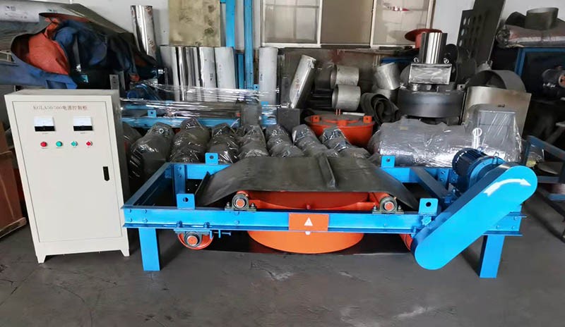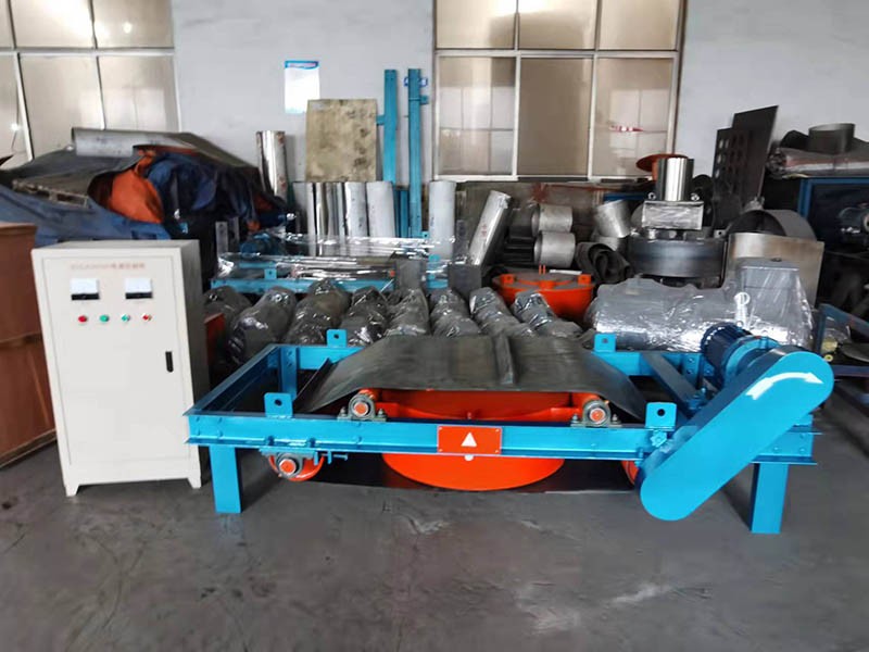 除鐵器自卸皮帶的運行方向與輸送皮帶運行方向垂直的方向自動清除鐵磁雜物??砂惭b在輸送皮帶上方(在除鐵器下方宜安裝非導(dǎo)磁直托輥)。