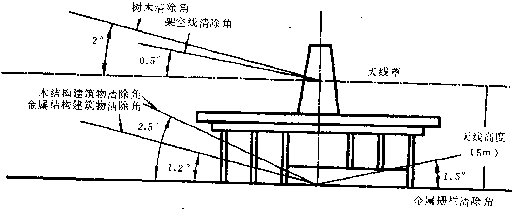3.6 以定向臺(tái)大線為中心,半徑700m以內(nèi)不得有110kV及以上的高壓輸電線;500m以內(nèi)不得有35kV及以上的高壓輸電線、電氣化鐵路和樹(shù)林;300 m以內(nèi)不得有架空金屬線纜、鐵路和公路;70m以內(nèi)不得有建筑物(機(jī)房除外)和樹(shù)木;70m以外建筑物的高度不應(yīng)超過(guò)以大線處地面為準(zhǔn)的2.5o垂直張角。