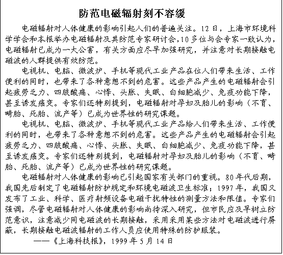 在您看電視的時候,您也許不會料到比高壓電纜所產(chǎn)生的電磁波還要強的電磁輻射正籠罩著您;在您用移動電話談妥一宗生意的時候,您不會想到手機天線集中釋放的電磁波已經(jīng)進(jìn)入了您的體內(nèi)……