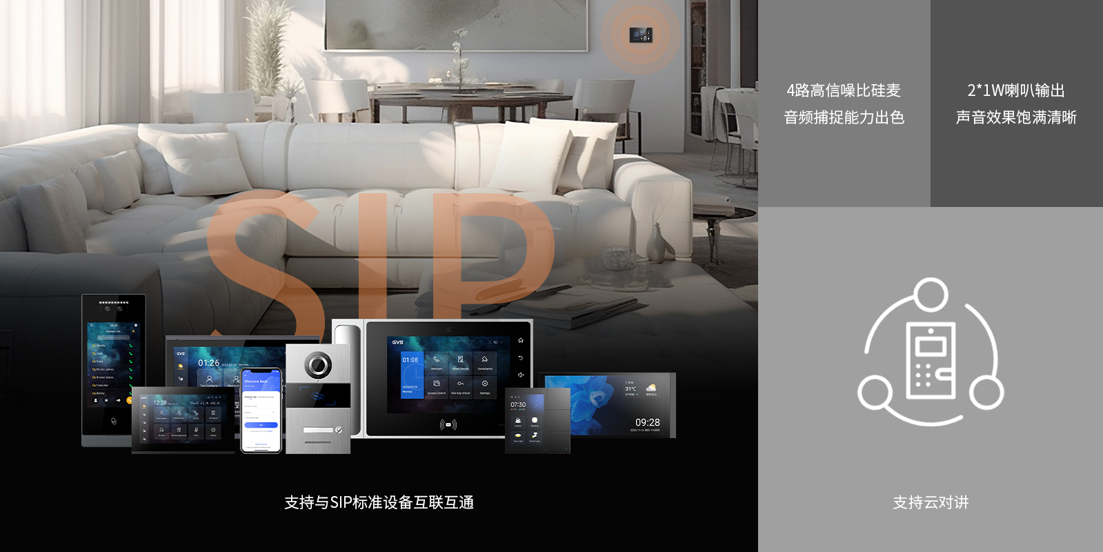 支持與SIP標(biāo)準(zhǔn)設(shè)備互聯(lián)互通,包括第三方標(biāo)準(zhǔn)SIP設(shè)備、SIP服務(wù)器,以及GVS S系列可視對(duì)講系統(tǒng)產(chǎn)品,如S3、S7等。