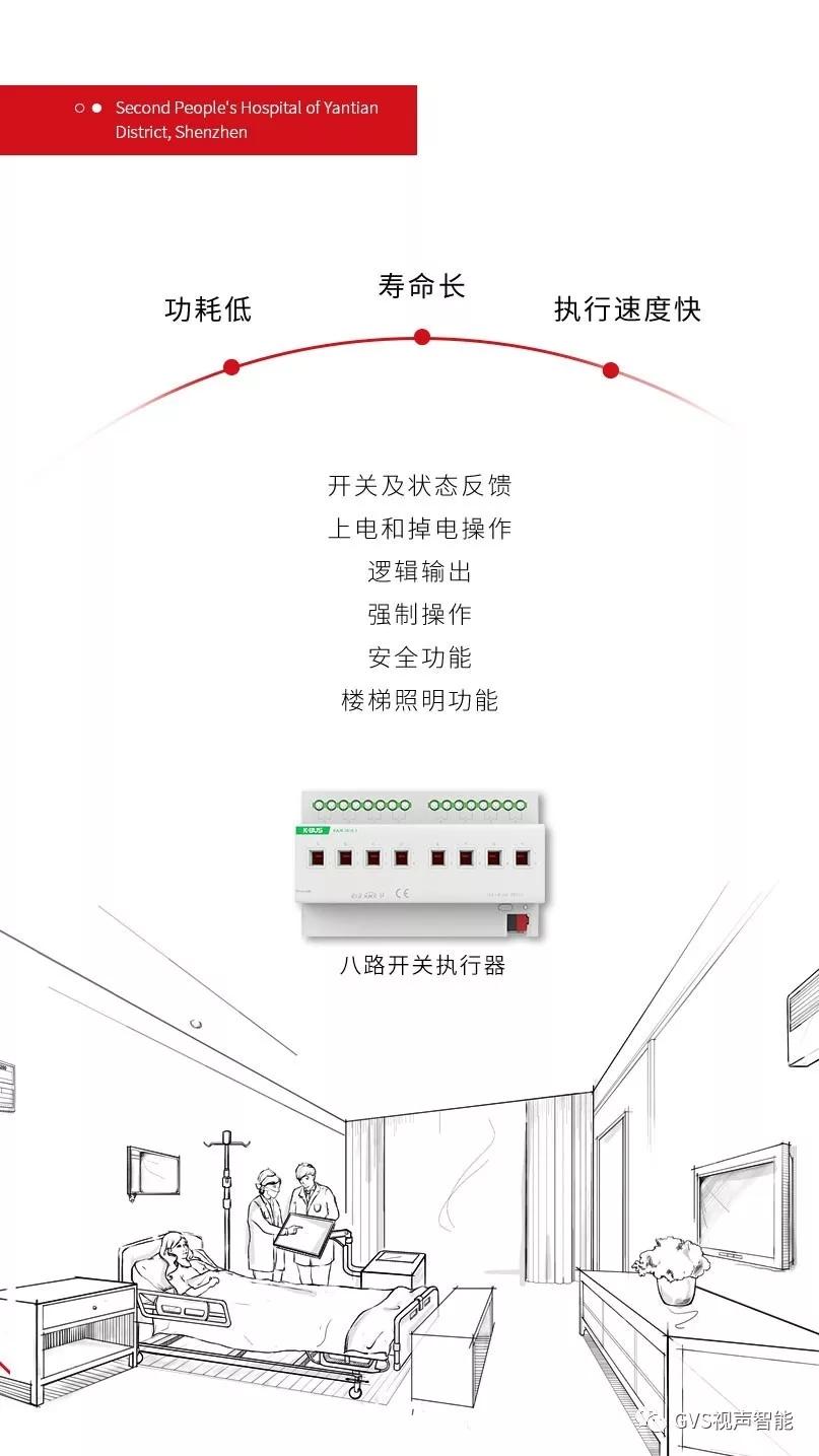 結(jié)合醫(yī)院實(shí)際情況,GVS視聲還為項(xiàng)目搭載了基于KNX協(xié)議的GVS八路開關(guān)執(zhí)行器、總線電源、線路耦合器等產(chǎn)品。