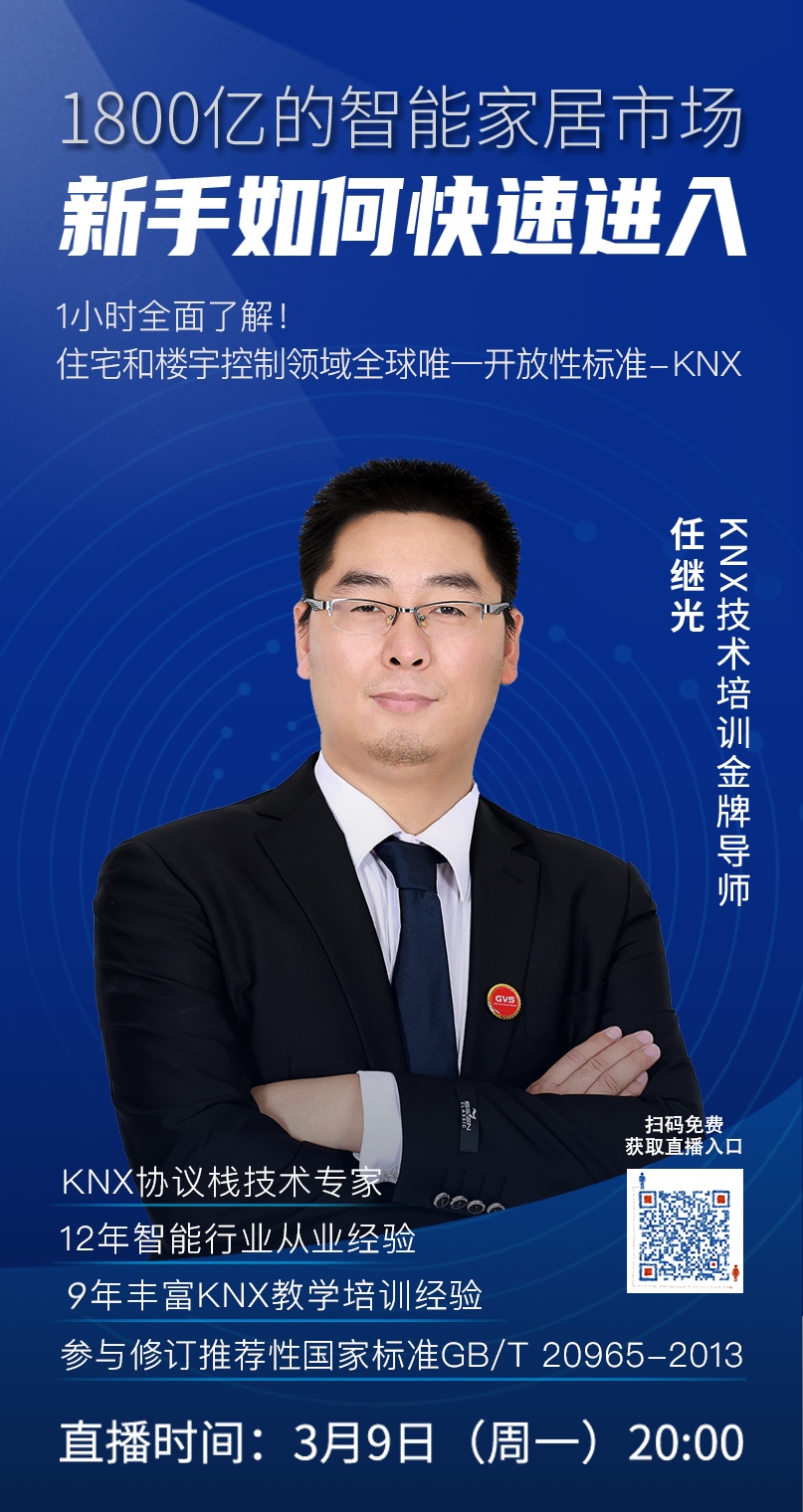 KNX是智能家居和樓宇控制領(lǐng)域的開放式國際標(biāo)準(zhǔn),也是中國國家標(biāo)準(zhǔn)GB/T 20965-2013。這一次,「智咖智能直播」不僅要讓你秒懂智能家居和樓宇控制技術(shù)基礎(chǔ)知識(shí),還會(huì)跟你零距離面授智能化項(xiàng)目的應(yīng)用訣竅,讓你足不出戶也能學(xué)到家!